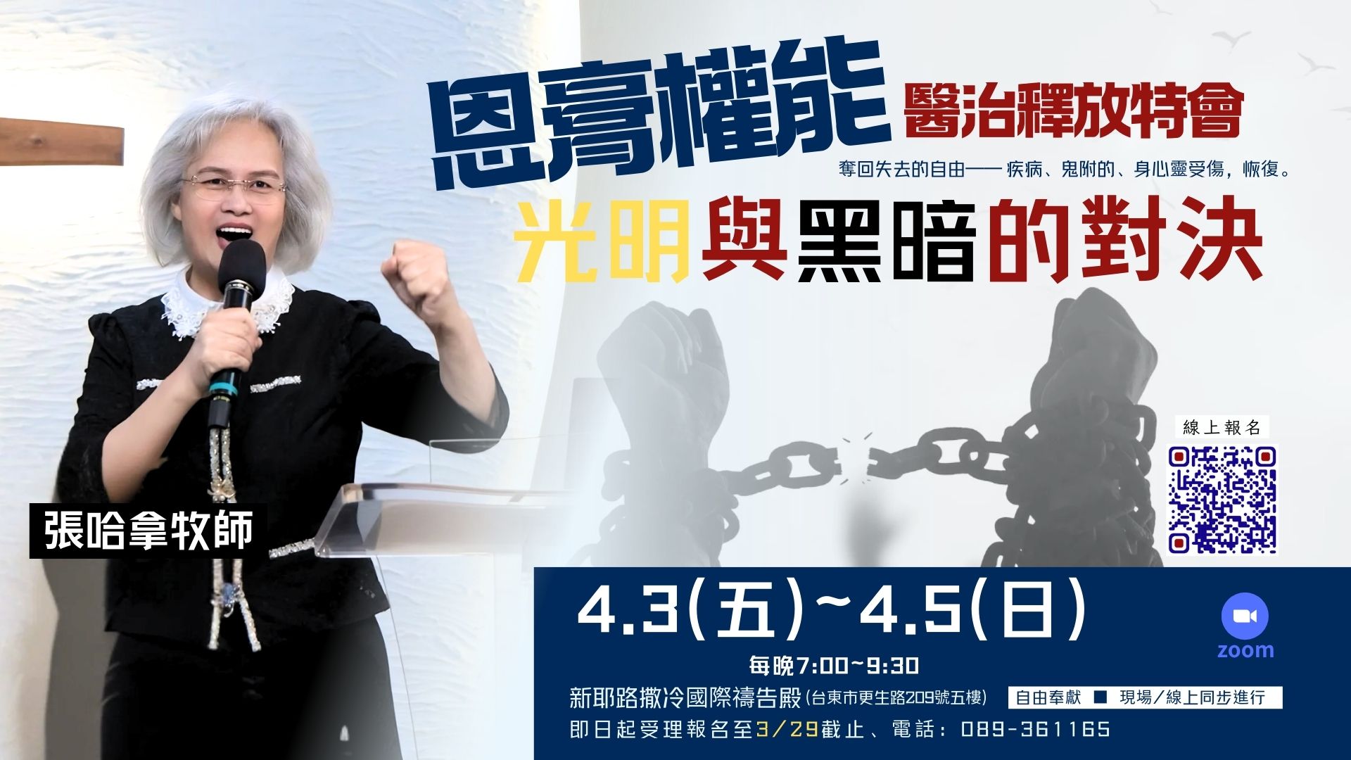 耶穌基督的名有權能,能醫治、能釋放;真 神的膏油能滋潤、柔軟、鬆綁、澆灌、恢復人心與地土。願心靈貧窮、正在尋找生命方向、站在十字路口的人哪,來吃吧!願心靈破碎、窮途末路,感覺天崩地塌的你,來喝吧!身患殘疾、久病纏身、心思不寧、受攪擾或失眠的,快來啊!口有所求、心有所要的人哪,來來來!誠摯邀請你──父 神眼中的珍寶,享受這三天屬靈豐盛大餐,必會親自經歷、體認並報告:被擄的得釋放,被囚的出監牢!得勝──是屬於你的!